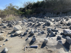 博物館講座で日南海岸から日向灘を望むと、遠くの貨物線が水平線から浮いています。 この日は、全国的に寒波のため気温が低下しました。海水温との差で蜃気楼が見られたのですね。